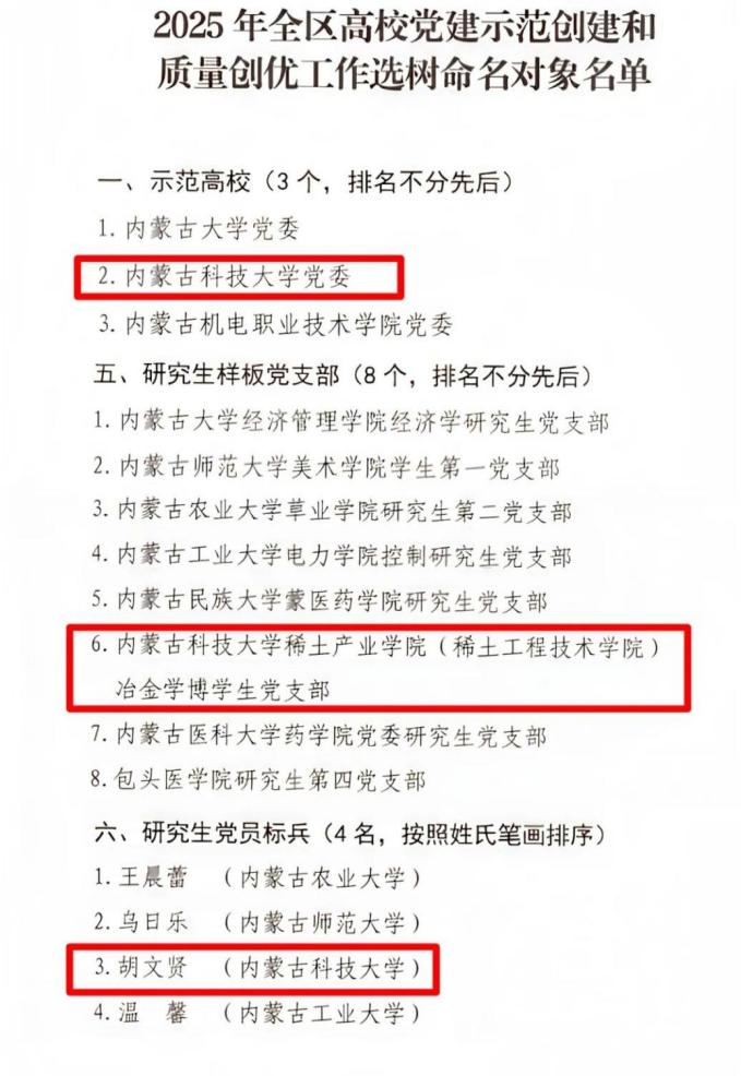 近日,自治区党委教育工委公示《2025年全区高校党建示范创建和质量创优工作选树命名对象名单》,内蒙古科技大学党委成功入选全区高校党建“双创”示范高校。其中,杏吧-杏吧原创