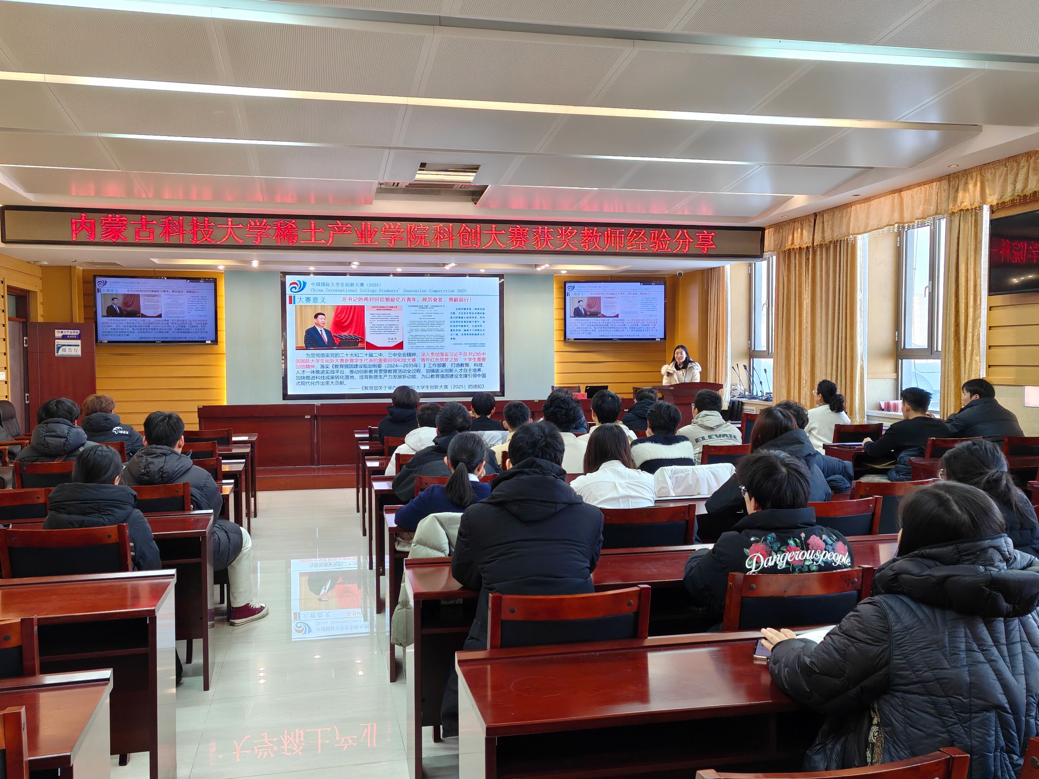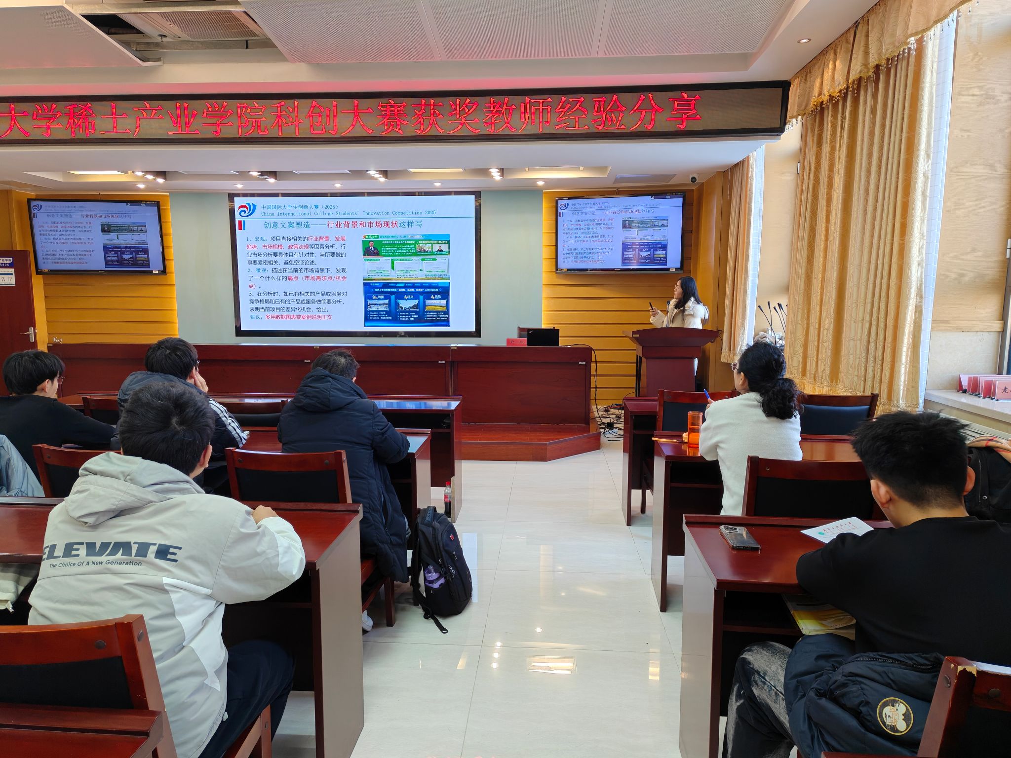 在会议室 A405 成功举办大赛经验分享活动。活动邀请到第八届、第十一届中国国际大学生创新大赛银奖优秀指导教师,同时荣获绿色矿山科学技术奖-科技进步一等奖、中国循环经济协会科学技术二等奖的许欣老师主讲。